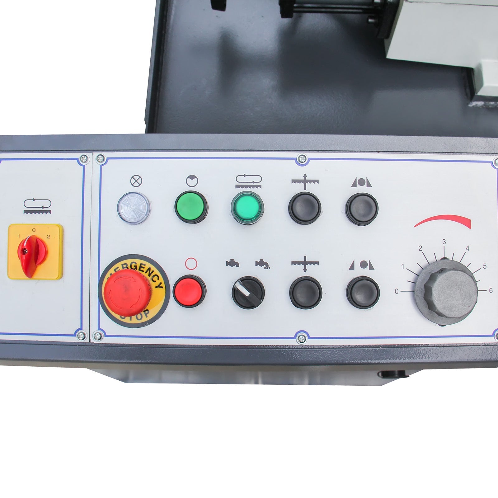 It runs on 230V power and is an industrial-grade double-column bandsaw. It uses a 3.0/4.0kW double-speed motor to achieve two saw blade speeds of 141 and 220 ft/min. Gear drive: The powerful motor provides the necessary torque to drive the bandsaw blade through metal workpieces with efficiency and accuracy. This bandsaw is capable of cutting a wide range of materials, including metals, plastics, composites, wood, rubber, foam, ceramics, glass, and more.