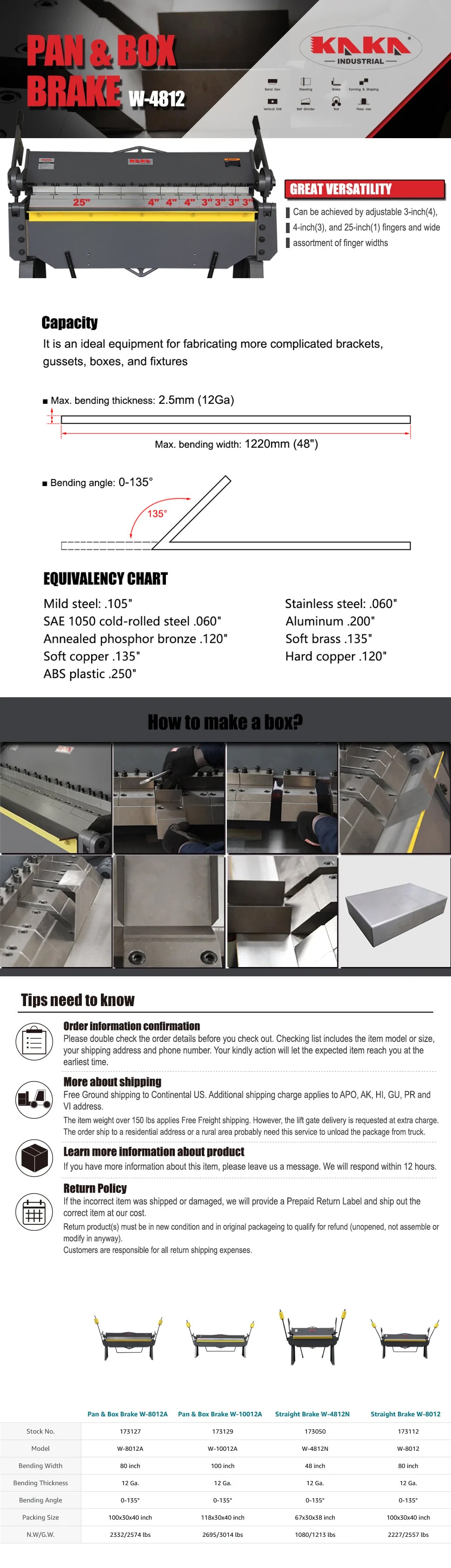 - This high-performance brake is capable of bending up to 12-gauge mild steel over its entire 48-inch length. It supports both box and pan bending as well as straight bends, accommodating various materials, including hot and cold rolled steel, stainless steel, copper, brass, and aluminum. The adjustable bending angle from 0° to 135° ensures precise, repeatable results for customized fabrication needs.